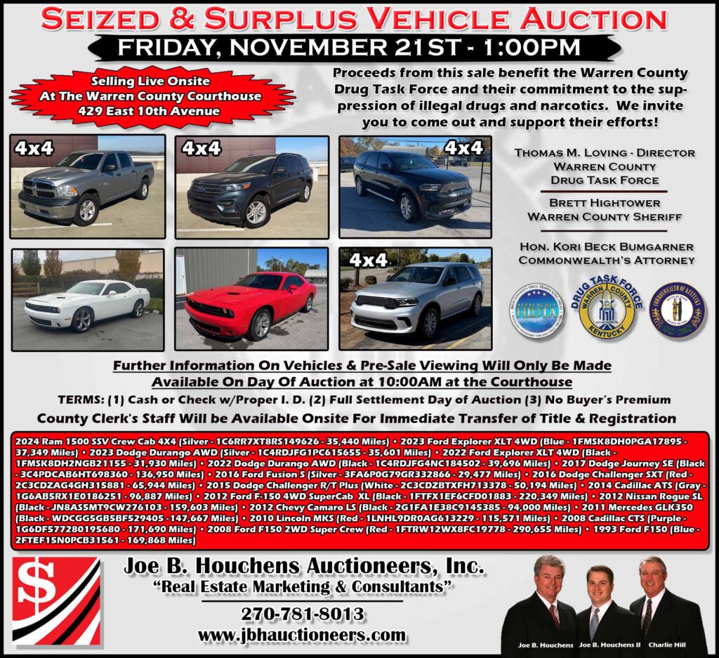 PROCEEDS TO BENEFIT THE WARREN COUNTY AND SOUTH CENTRAL DRUG TASK FORCES! VEHICLES WILL BE MADE AVAILABLE FOR VIEWING ON THE DAY OF AUCTION ONLY.